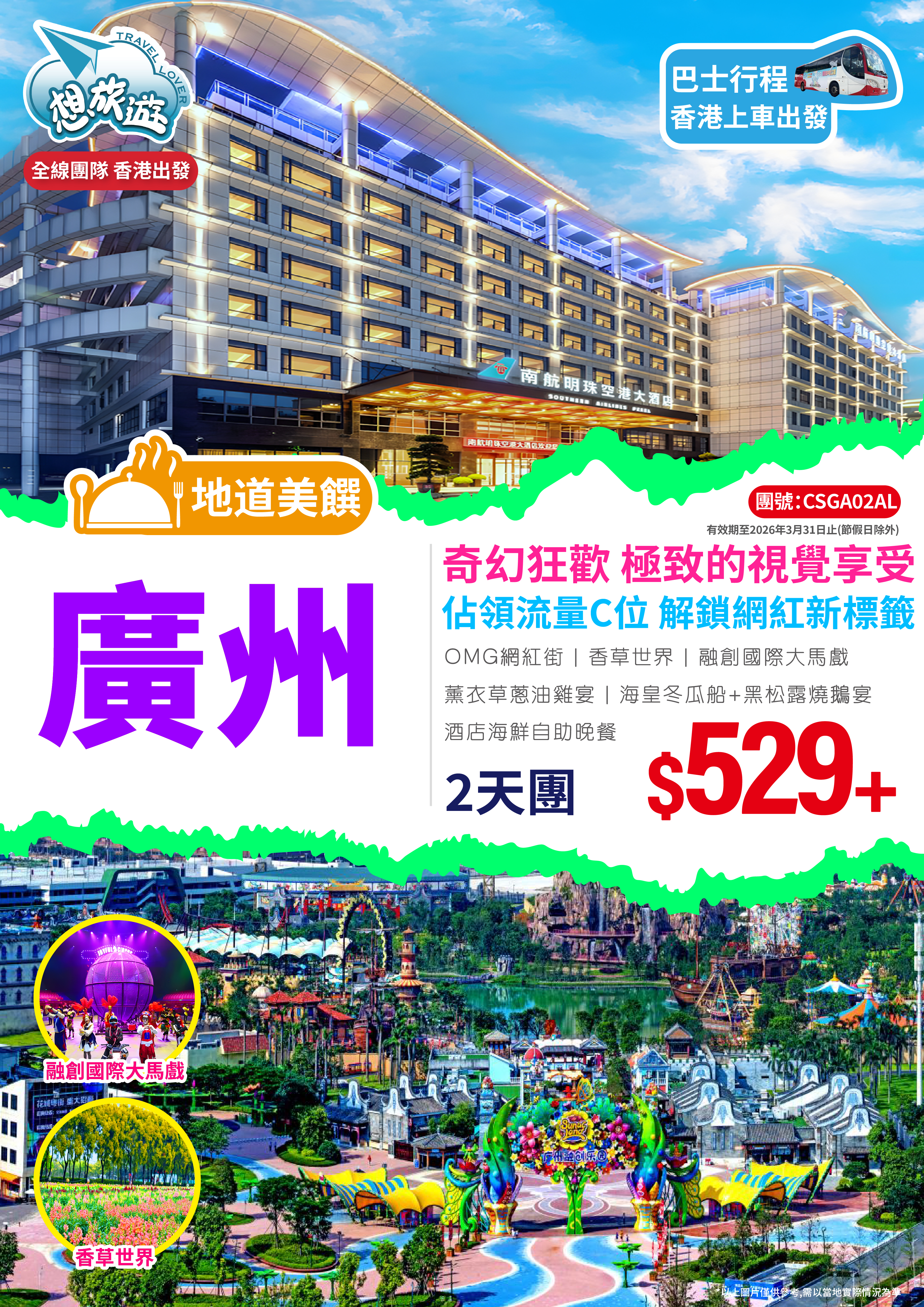 融創大馬戲、香草世界、酒店海鮮自助晚餐 2天團