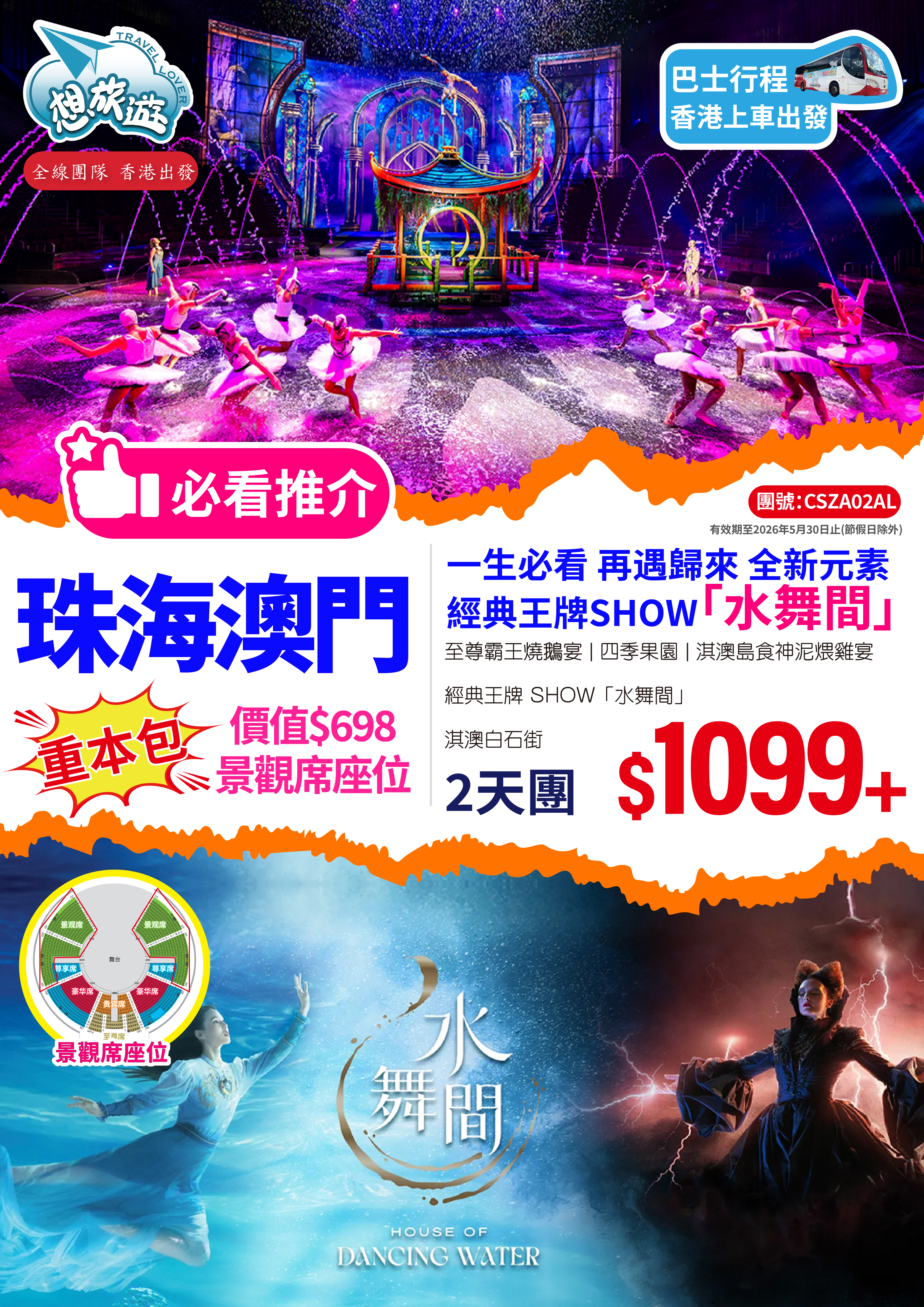 特別安排想旅遊貴賓尊享【澳門專車+澳門導遊】重本包2025年5月全新升級~重磅回歸一生必看的水上匯演 『澳門新濠天地·水舞間』價值$698景觀席座位 2天團