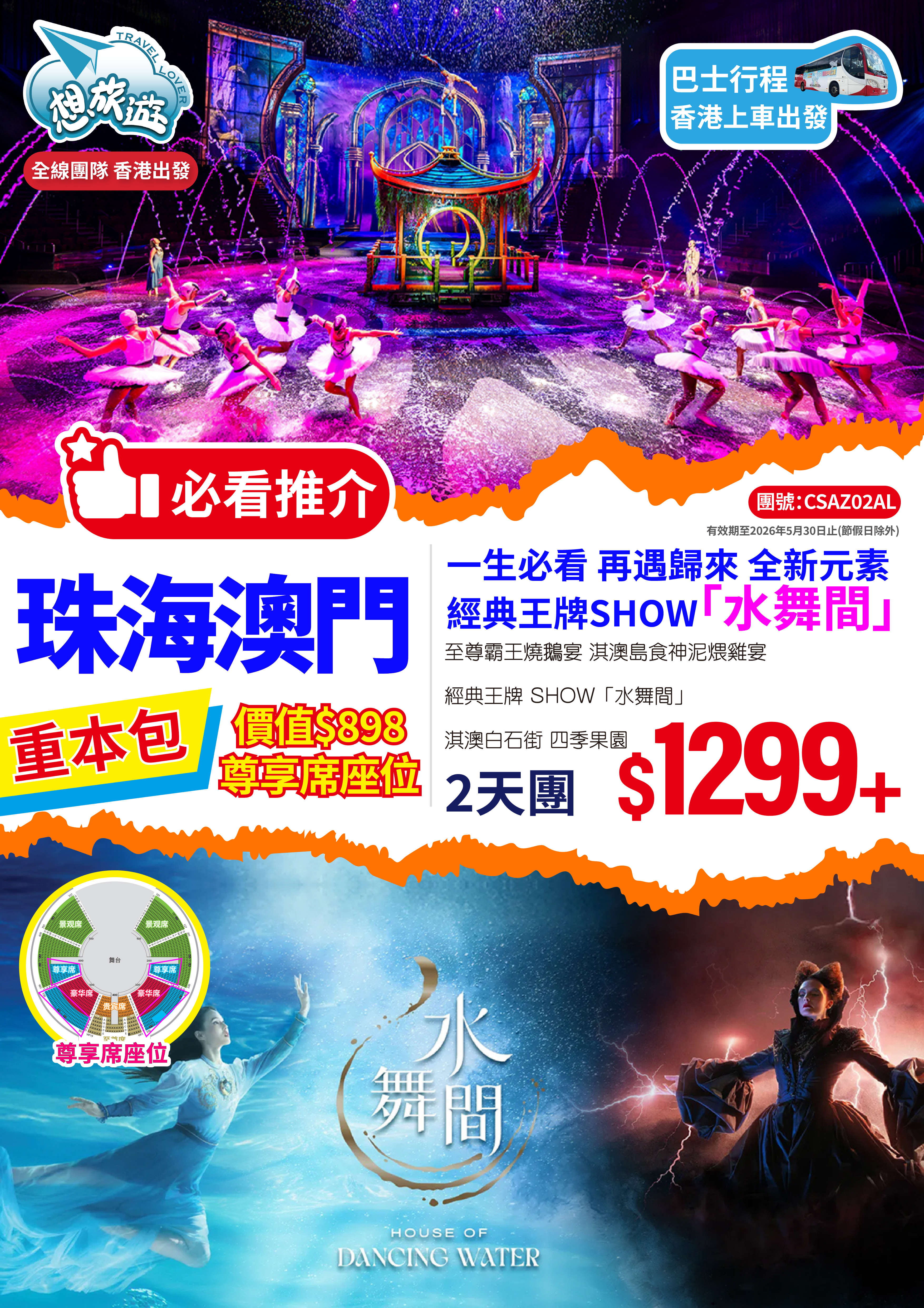 重本包價值$898的尊享席座位-2025年5月全新升級~重磅回歸一生必看的水上匯演 『澳門新濠天地·水舞間』2天團