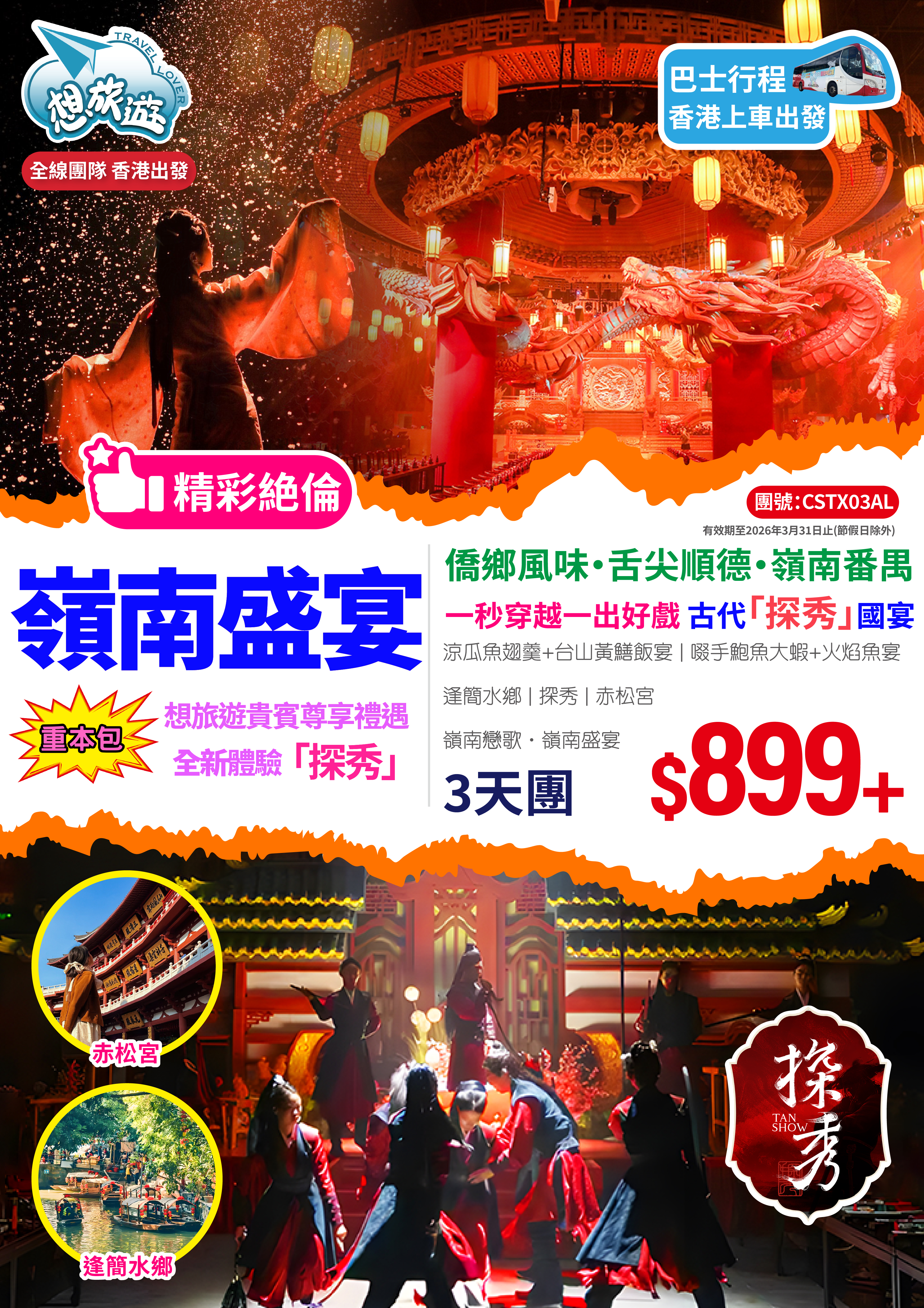 【僑鄉風味·舌尖順德·嶺南番禺】 一秒穿越一出好戲 全景沉浸式穿越古代國宴【嶺南戀歌‧嶺南盛宴】純玩3天團