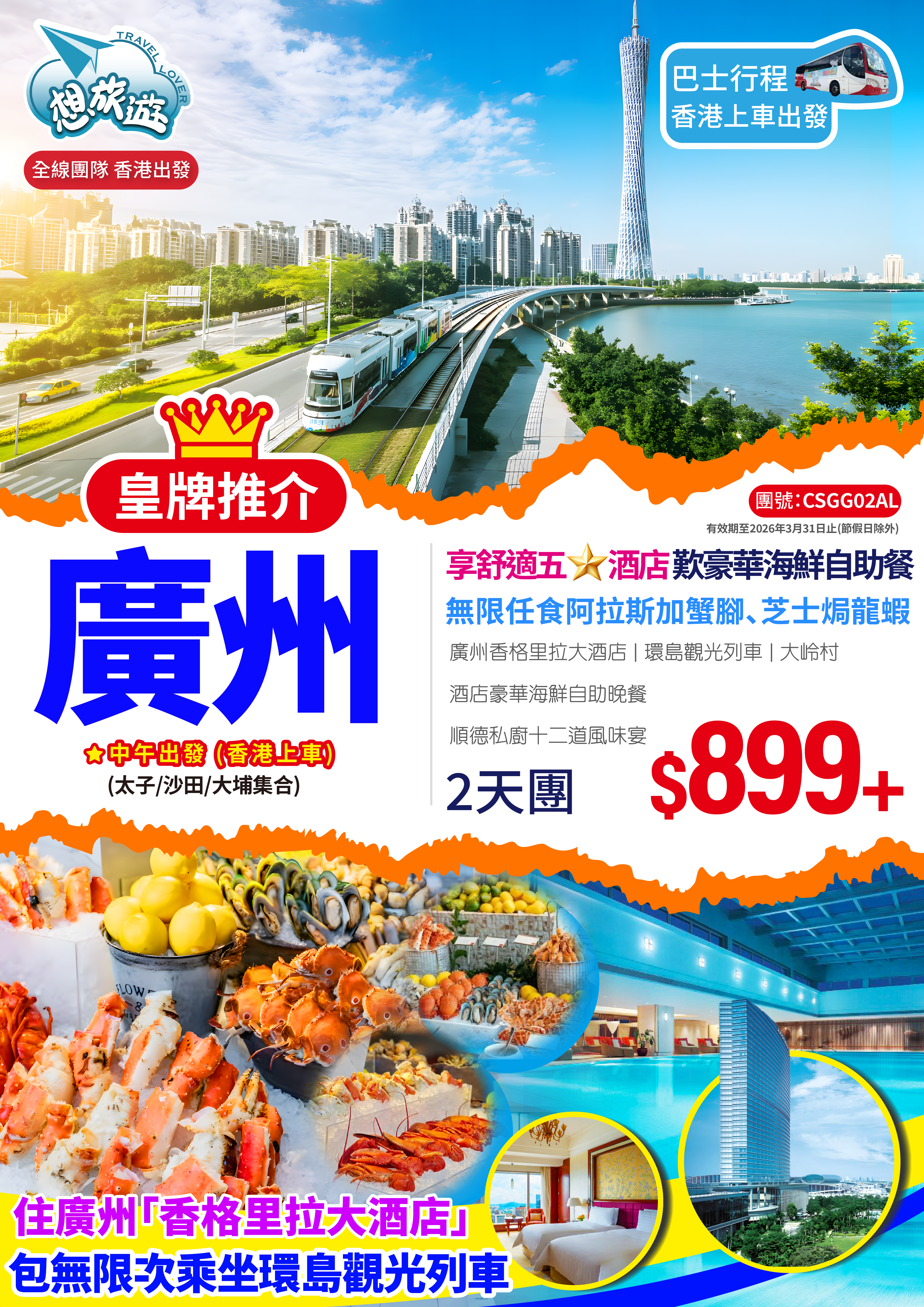 入住豪華五星【廣州香格里拉大酒店】豪歎【酒店豪華海鮮自助晚餐】無限任吃阿拉斯蟹腳、芝士焗龍蝦等等 重本包無限次【環島觀光列車】暢遊網紅景點純玩天半團