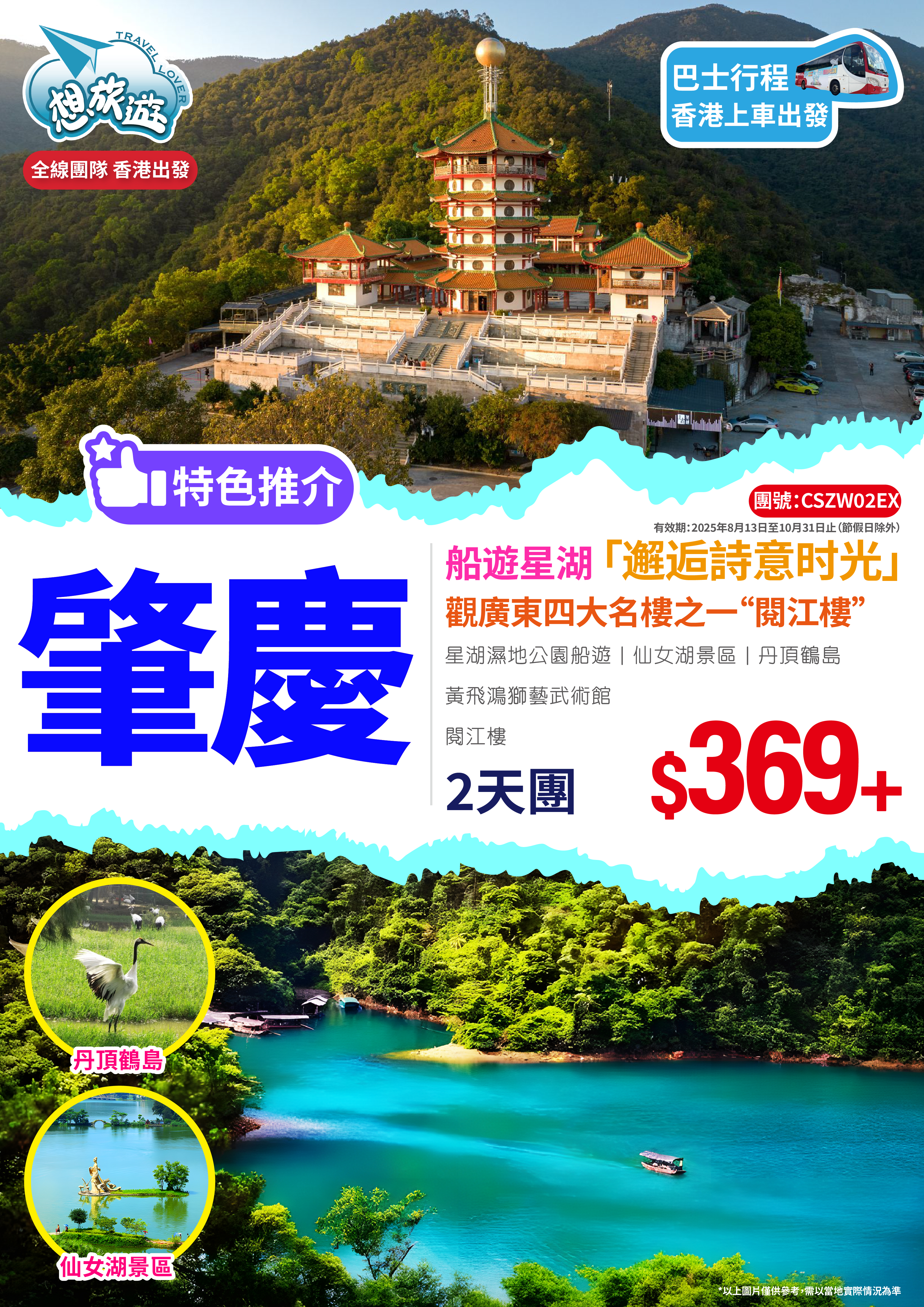肇慶重本包【星湖濕地公園船遊+仙女湖景區+丹頂鶴島】 2天團
