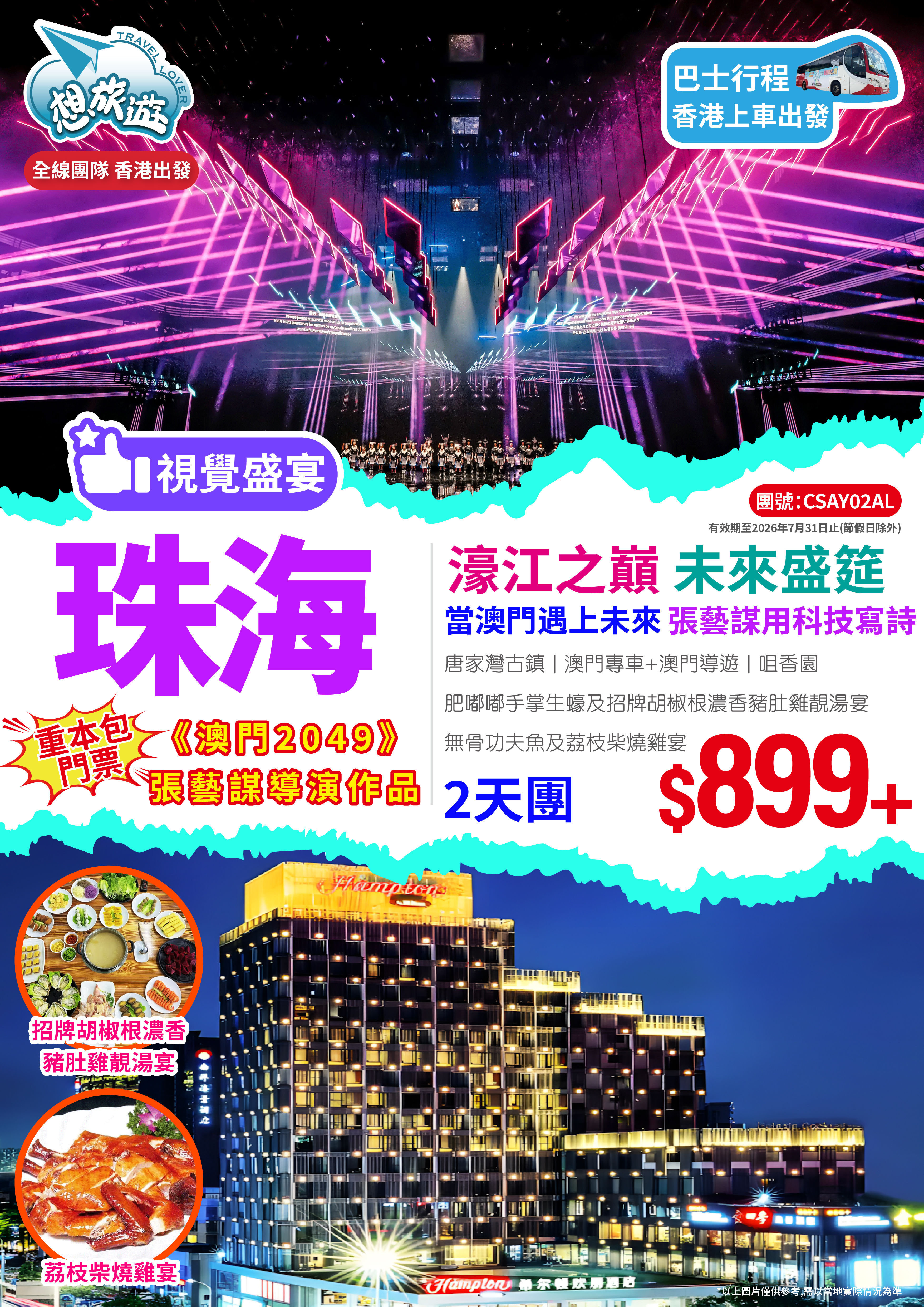 中山/珠海/澳門/張藝謀導演作品/國際品牌酒店/尊享澳門車+澳門導遊/純玩/澳門2049