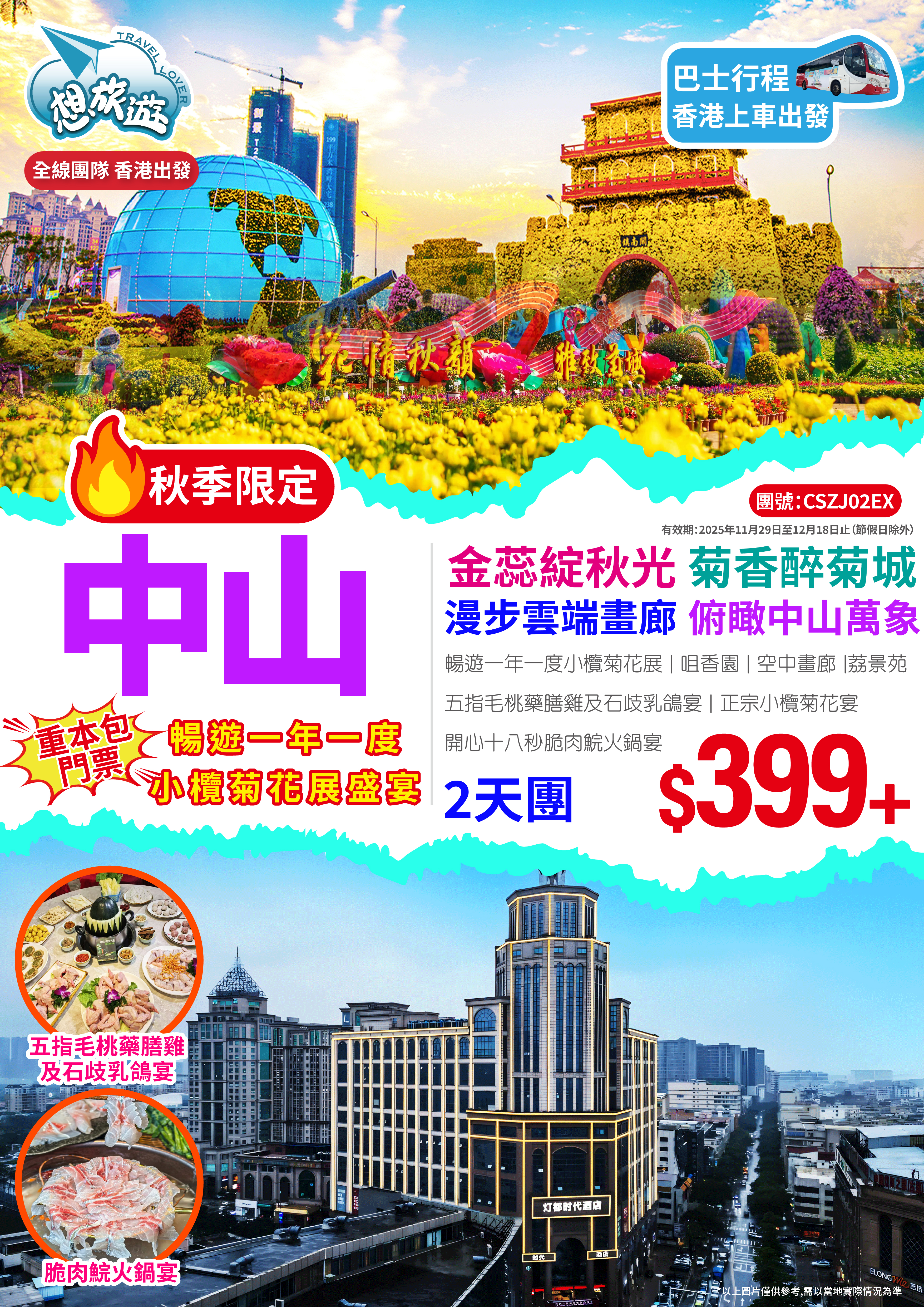 重本包門票《一年一度小欖菊花展盛宴》【五指毛桃藥膳雞+石歧乳鴿宴】 【招開心十八秒脆肉鲩火鍋宴】【正宗小欖菊花宴】純玩2天團