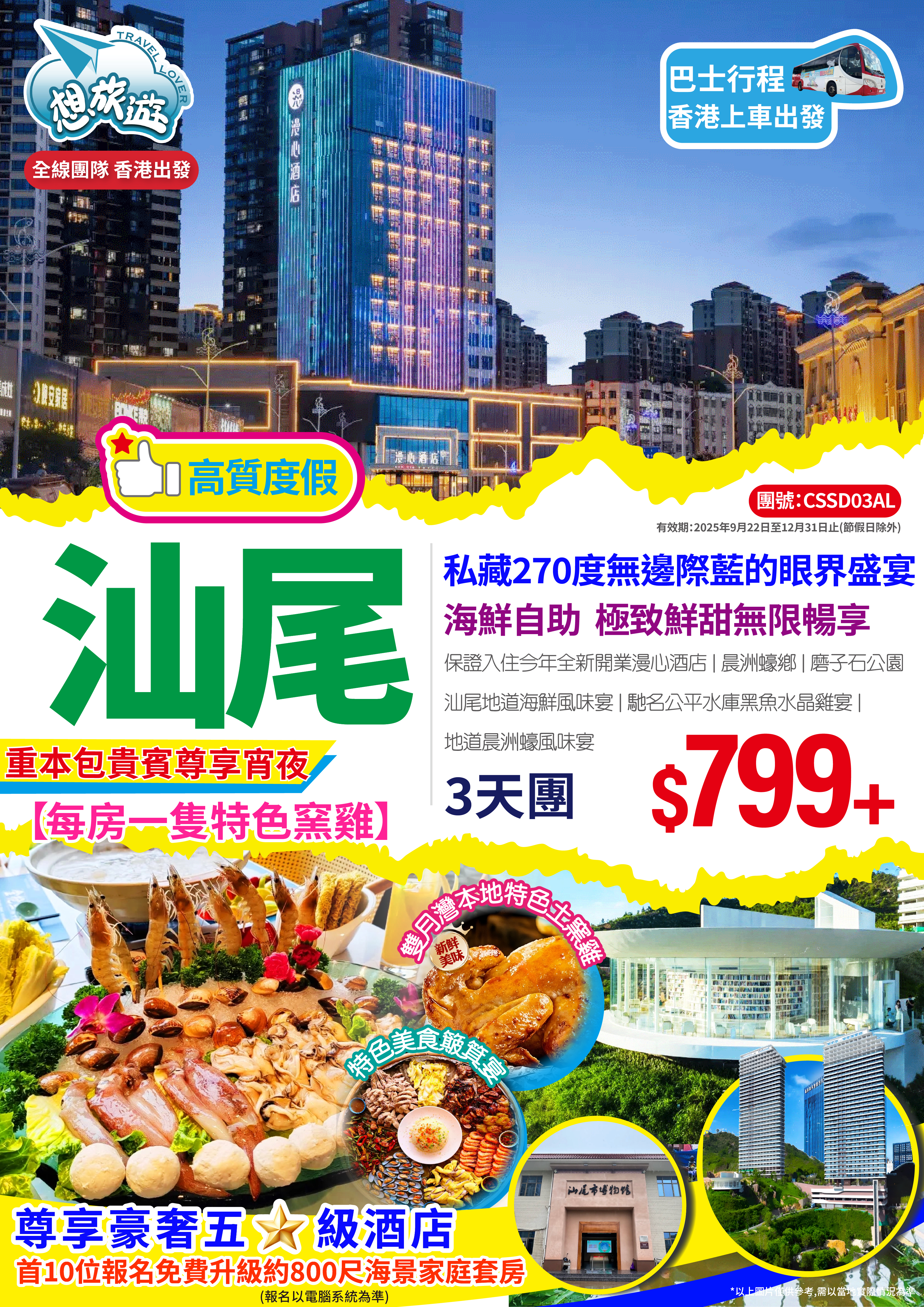1. 團費不包括香港旅遊業監管局0.15%印花稅。2. 酒店、膳食及行程次序如有改動,均以當地接待單位安排為準。3. 車座位位置以當天本公司安排作準客人不得異議。4. 為使旅客獲得完善的旅遊保障,本公司建議所有團員出發前必須自行購買旅遊綜合保險5. 團費可能因人民幣、交通、酒店或市場價格浮動而 有所更改確實團費以報名時為準,恕不另行通知。6. 報名細則及責任問題,請參閱行程單張內或瀏覽想旅遊官方網站,如有更改恕不另行通知7. 團費未包括當地導遊、旅遊車司機及旅行社相關人員之服務費每位每天HK$80 並於完團前由導遊個別向團員收取。8. 於公眾假期出發之團隊為避免集合地點/海關關口過於擠迫,集合時間將可能提早或延後,最後以本公司通知客人作準,敬請留意。9. (高鐵及廣東省) 團隊或不設香港領隊,但仍設當地導遊接待 . (飛機線) 如團隊人數為14人以下,團隊或不設香港領隊, 但仍設當地導遊接待 , 所有不設領隊將安派工作人員於指定集合地點安排集合事宜。10. 本團不設與導遊夾房,所有單數報名者,必須補回單人房附加費。11. 為確保消費者權益,詳情請參閱 (旅⾏團報名及責任細則),客⼈可向分⾏職員索取。12. 所有單張及網頁之圖片僅供參考。13. 旅客必須取得印花收據方可獲得『旅遊業監管局賠償基金』保障。Travellers must obtain a receipt with a levy stamp to be protected by the Travel Industry Compensation Fund。