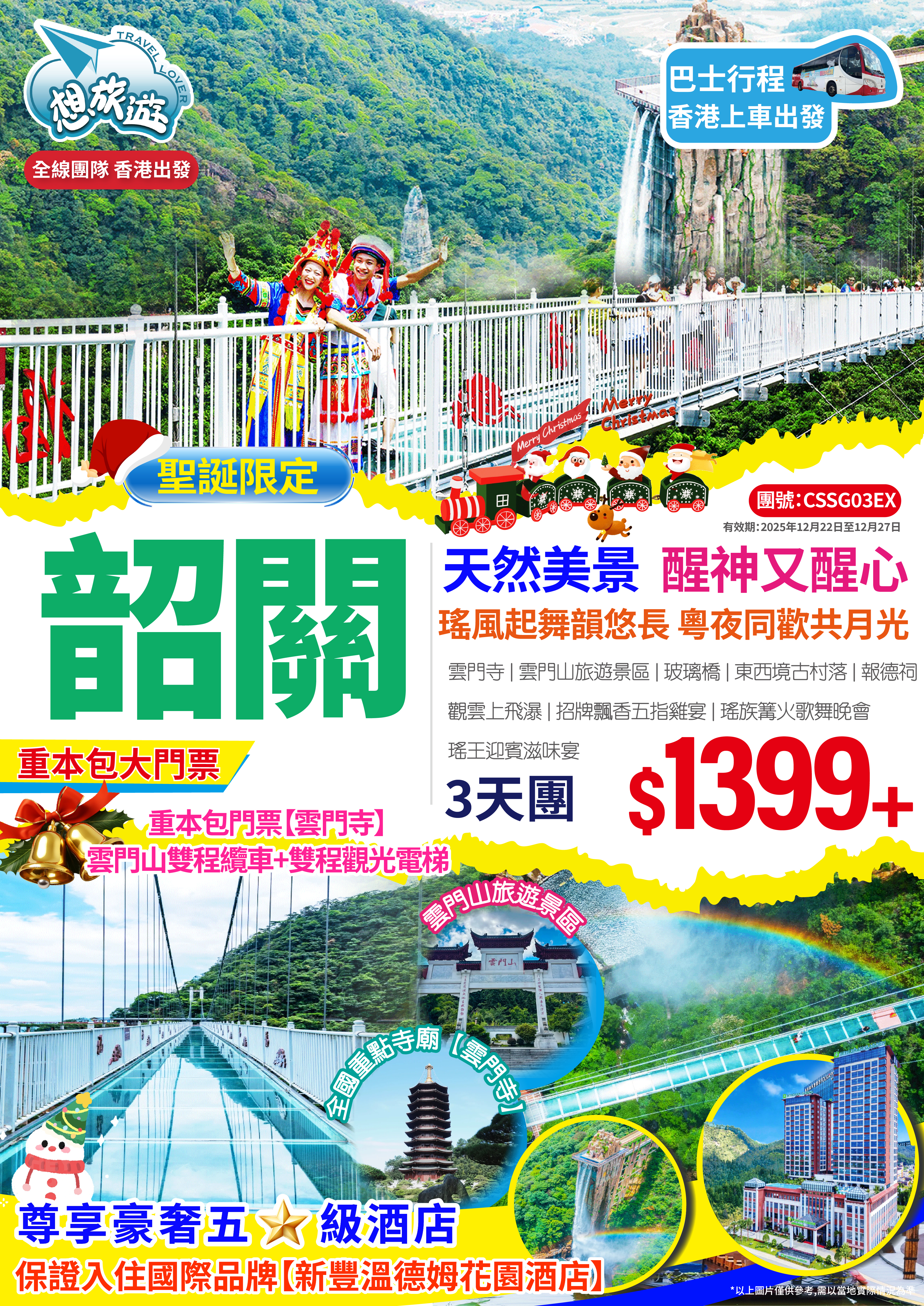 【聖誕限定】全新開業國際品牌新豐溫德姆花園酒店【露台獨立溫泉泡池客房】 雲門山旅遊區 包雙程索道及觀光電梯觀雲上飛瀑 遊覽全透明高空玻璃橋 純玩3天團