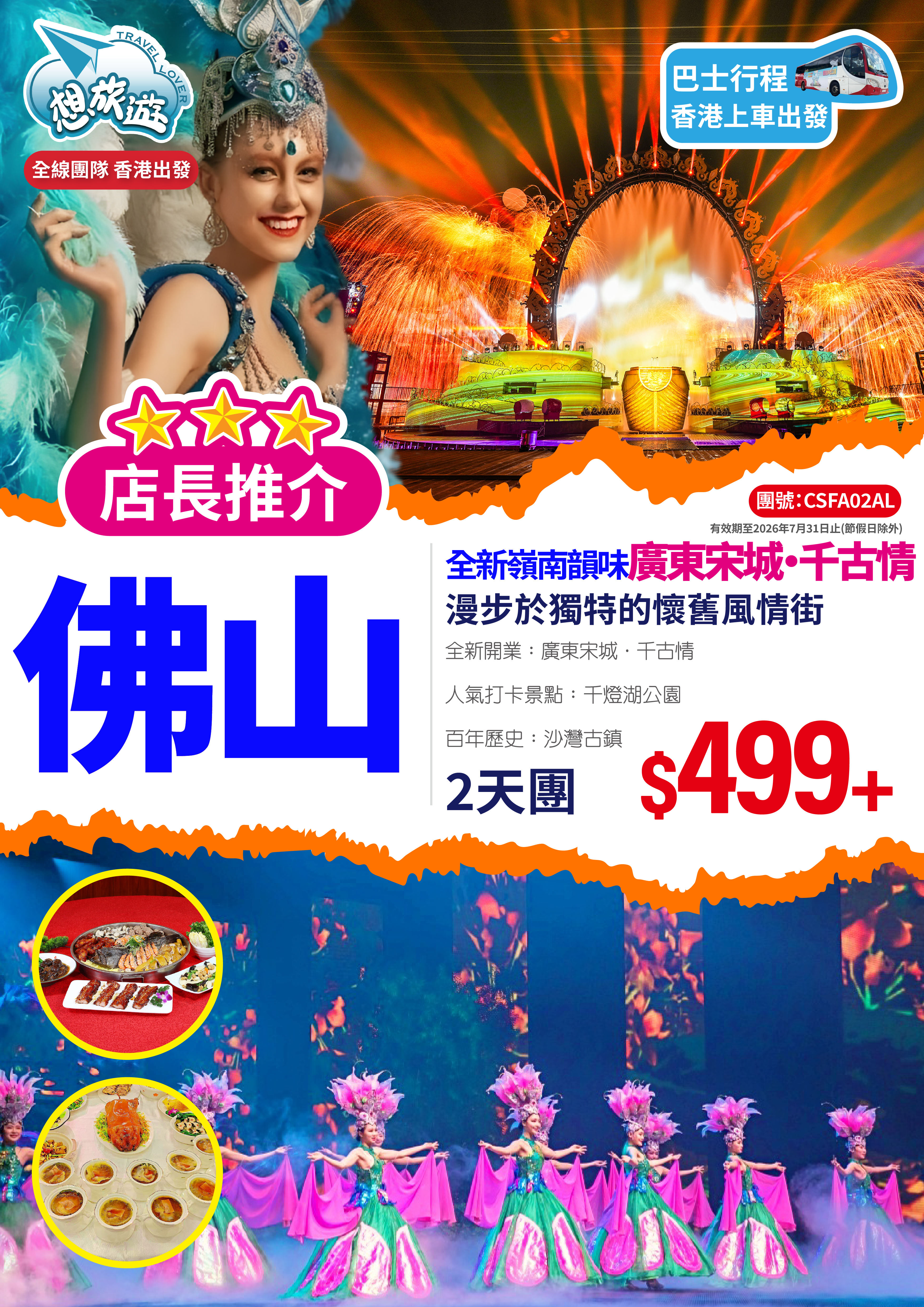 全新開業《廣東宋城•千古情》 炊漲魚蝦蟹宴· 位上火瞳翅+每席一只脆皮發財金豬 2天團