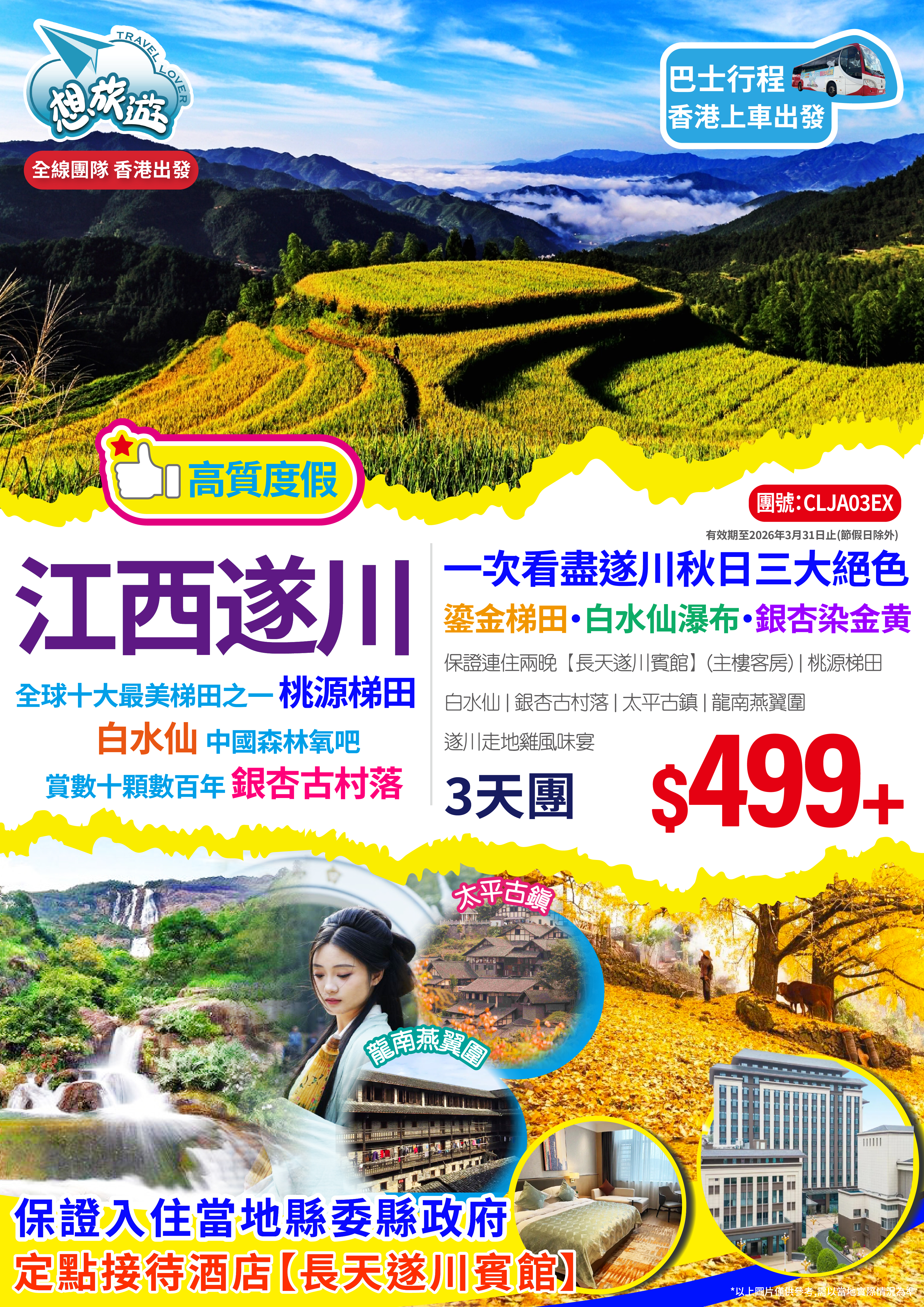 1. 團費不包括香港旅遊業監管局0.15%印花稅。2. 團費未包括當地導遊、旅遊車司機及旅行社相關人員之服務費每位每天HK$130,於完團前由領隊/導遊個別向團員收取。3. 以上行程價格未含機場稅、燃油附加費及行政費等稅項,實際税項收費以出發當日及最終乘坐之航空公司收費為準,有關費用可到想旅遊網站查看或向職員查詢。4. 為使旅客獲得完善的旅遊保障,本公司建議所有團員出發前必須自行購買旅遊綜合保險。5. 航班有可能作出更改,最終以航空公司安排作準;酒店、膳食及行程次序有可能因應實際情況而變動,均以航空公司及當地接待社安排為準,如有任何更改,恕不另行通知。6. 如遇以上酒店客滿,本公司將安排同級之酒店。7. 確實團費均以報名時為準,旺季加幅另行通知。8. 為確保消費者權益,詳情請參閱 (旅⾏團報名及責任細則),客⼈可向分⾏職員索取。9. (高鐵及廣東省) 團隊或不設香港領隊,但仍設當地導遊接待 . (飛機線) 如團隊人數為14人以下,團隊或不設香港領隊, 但仍設當地導遊接待 , 所有不設領隊將安派工作人員於指定集合地點安排集合事宜。10. 根據旅遊業監管局(旅監局)指引,旅行社如因『迫不得已理由』取消旅行團,處理相關退款時可收取主要服務供應商因應旅行團取消而徵收之退票及手續費,確實金額以供應商之最終回覆作準;有關收費請參閱旅行團細則及責任問題須知。或可自行瀏覽旅監局網站(https:tia.org.hk/)11. 所有單張及網頁之圖片僅供參考。12. 此團隊不設茶會,敬請留意。13. 旅客必須取得印花收據方可獲得『旅遊業監管局賠償基金』保障。Travellers must obtain a receipt with a levy stamp to be protected by the Travel Industry Compensation Fund。
