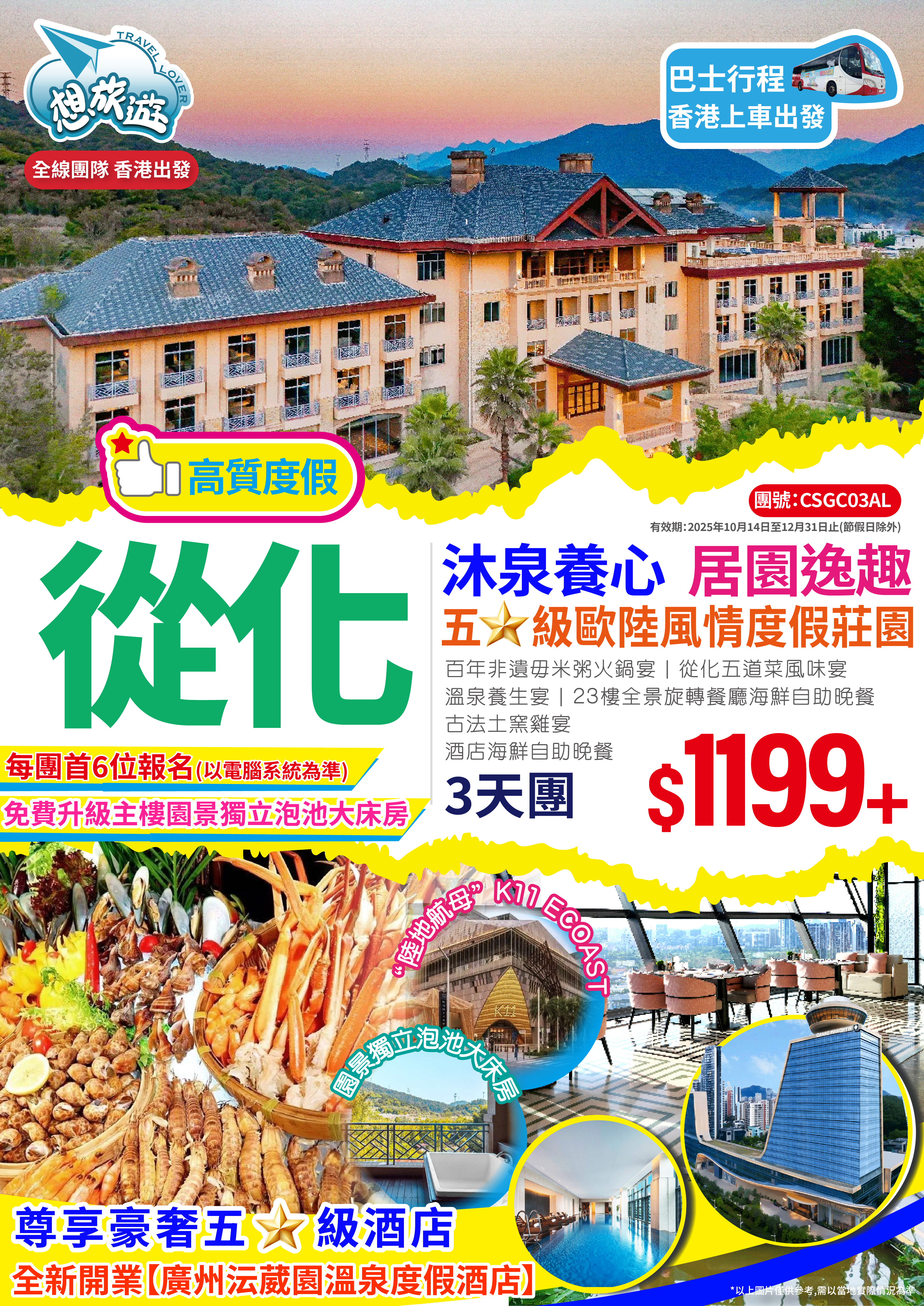 全新開業五星級標準【廣州滄葳園溫泉度假酒店】+國際品牌五星級標準【光明溫德姆至尊酒店】尊享酒店自助晚餐 尊享房間歡迎水果 英倫下午茶 無限次享受世界珍稀溫泉 純玩3天團