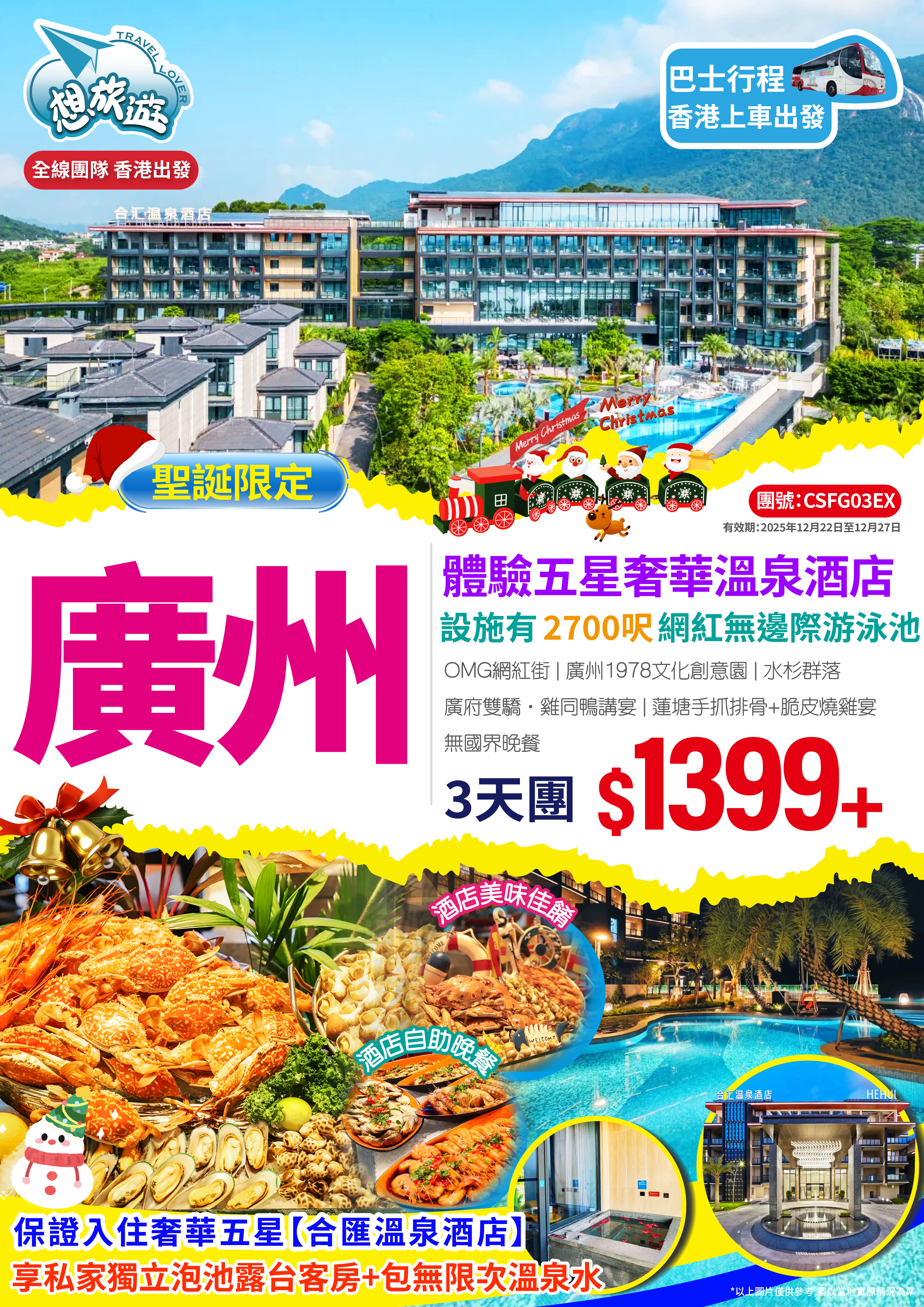 【聖誕限定】兩晚五星標準【南海金融城酒店】【合匯溫泉酒店】豪歎兩晚酒店自助晚餐3天團