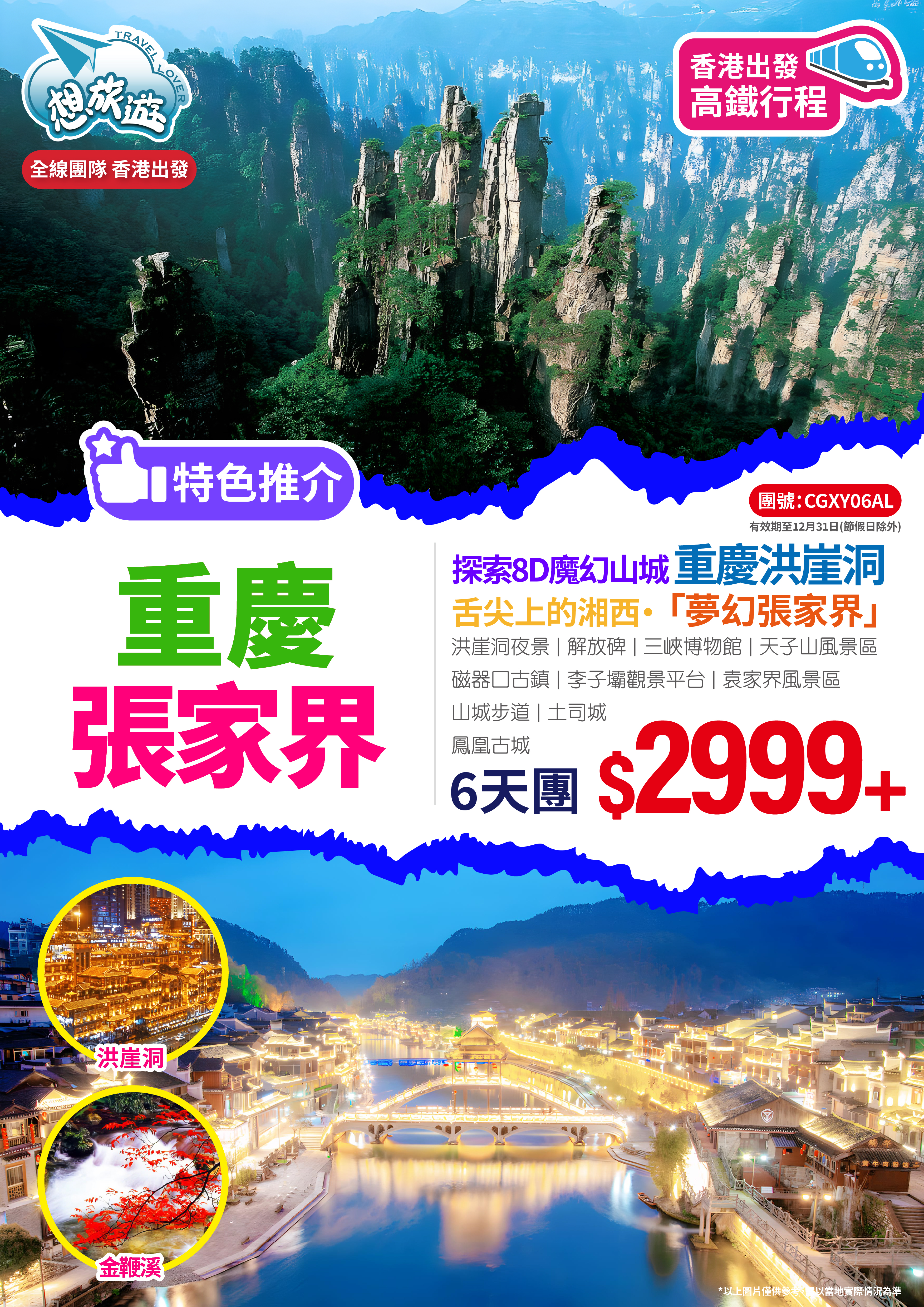 重慶魔幻山城 湖南張家界雙城聯遊 高鐵6天團