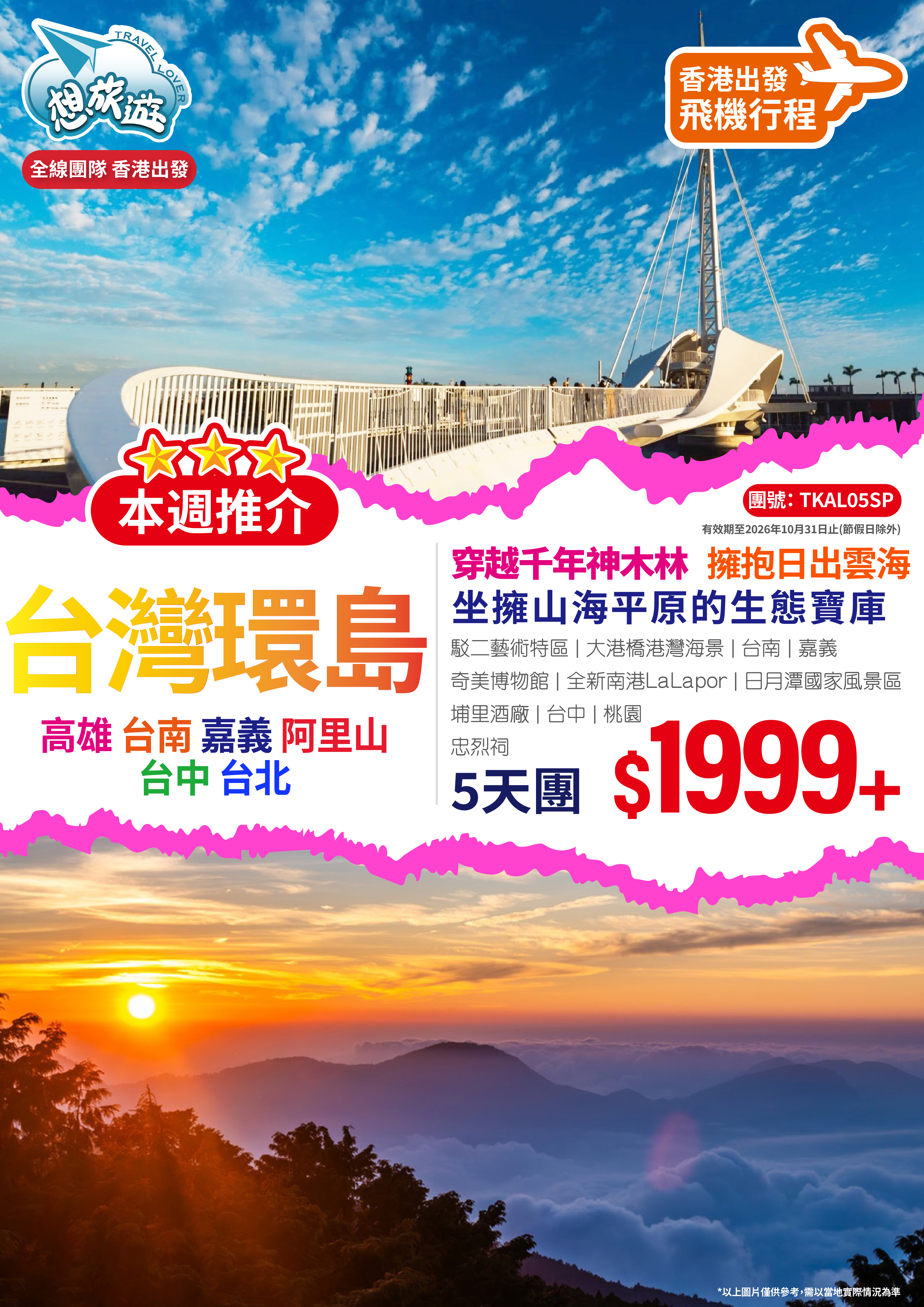 台灣【高雄、阿里山、日月潭、台中、台北】逍遙遊5天團