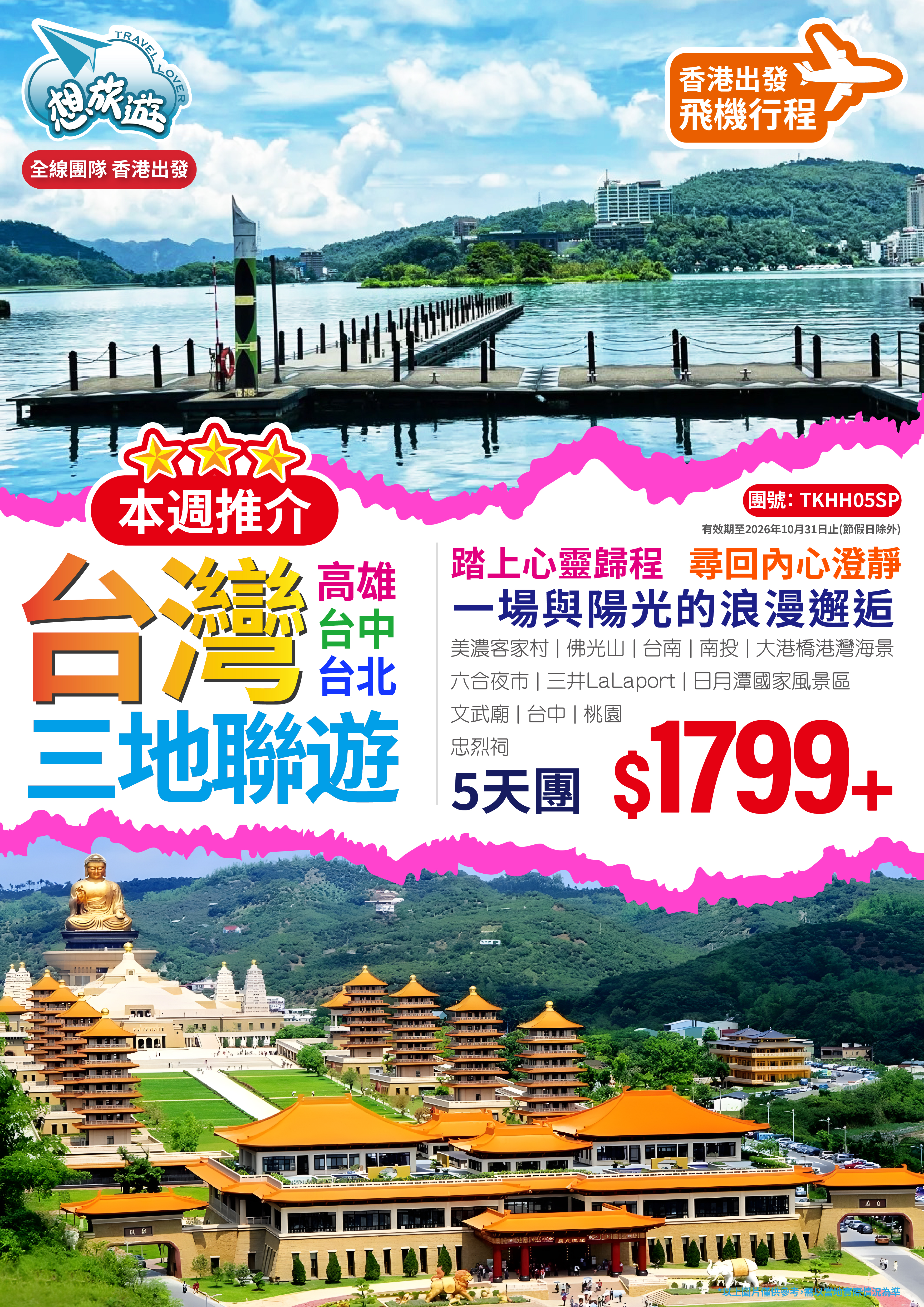 1. 團費不包括香港旅遊業監管局0.15%印花稅。2. 團費未包括當地導遊、旅遊車司機及旅行社相關人員之服務費每位每天HK$150,完團前由領隊/導遊個別向團員收取。3. 旅遊證件必須於回程當日起計,最少六個月或以上有效期,均需預留一頁空白版面,方能報名參加。4. 所有入境台灣之旅客必須持有有效的入境或過境簽證,因證件問題而引致的延誤或額外開支,包括各項手續費等,本公司概不承擔任何責任及損失。5. 有關台灣簽證事項,請參閱相關網址或向本社職員查詢:內政部移民署全球資訊網及台灣免簽證適用國家名冊。6. 為使旅客獲得完善的旅遊保障,本公司建議所有團員出發前必須自行購買旅遊綜合保險7. 以上⾏程價格未含機場稅、燃油附加費及⾏政費等稅項,實際稅項收費以出發當⽇及最終乘坐之航空公司收費為準,有關費⽤可瀏覽想旅遊網站查看或向職員查詢。8. 酒店、膳食及⾏程次序有可能因應實際情況⽽變動,均以航空公司及當地接待社安排為準,如有任何更改,恕不另⾏通知。9. 航班時間只供參考及有可能更改,一切以航空公司公佈為準。此團有可能配搭不同航空公司之來回航班,顧客不得藉此而退出10. 如遇以上酒店客滿,本公司將安排同級之酒店11. 確實團費均以報名時為準,旺季加幅另⾏通知 12. 為確保消費者權益,詳情請參閱 (旅⾏團報名及責任細則),客⼈可向分⾏職員索取。13. 根據旅遊業監管局(旅監局)指引,旅⾏社如因『迫不得已理由』取消旅⾏團,處理相關退款時可收取主要服務供應商因應旅⾏團取消⽽徵收之退票及⼿續費,確實⾦額以供應商之最終回覆作準;有關收費請參閱旅⾏團細則及責任問題須知。或可⾃⾏瀏覽旅監局網站(https:tia.org.hk/)14. 所有單張及網頁之圖片僅供參考。15. 此團隊不設茶會,敬請留意。16. (高鐵及廣東省) 團隊或不設香港領隊,但仍設當地導遊接待 . (飛機線) 如團隊人數為14人以下,團隊或不設香港領隊, 但仍設當地導遊接待 , 所有不設領隊將安派工作。17. 旅客必須取得印花收據方可獲得『旅遊業監管局賠償基金』保障。Travellers must obtain a receipt with a levy stamp to be protected by the Travel Indu