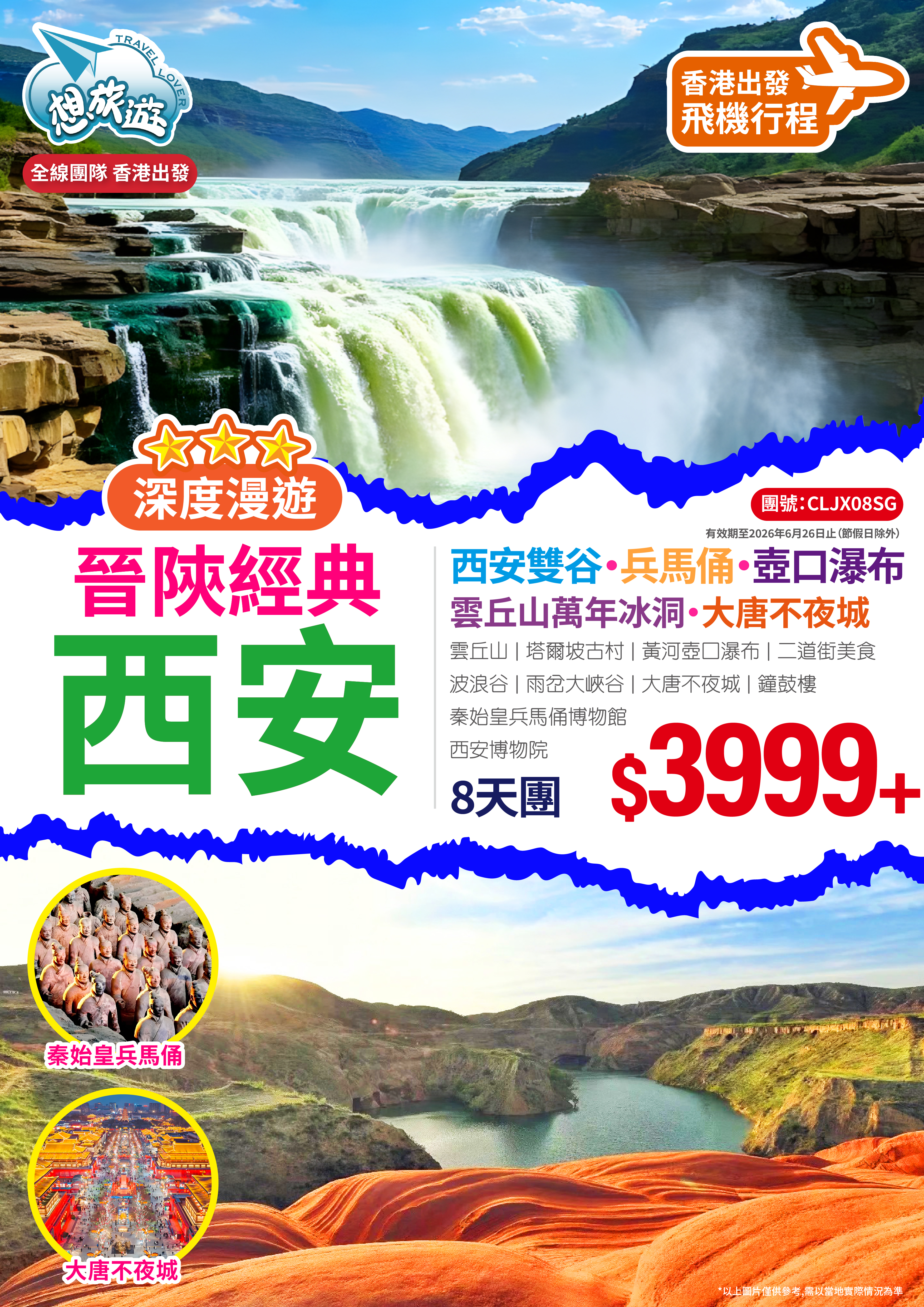 晉陝經典兩省純玩-西安雙谷·兵馬俑·壺口瀑布 雲丘山萬年冰洞·大唐不夜城 直航8天團