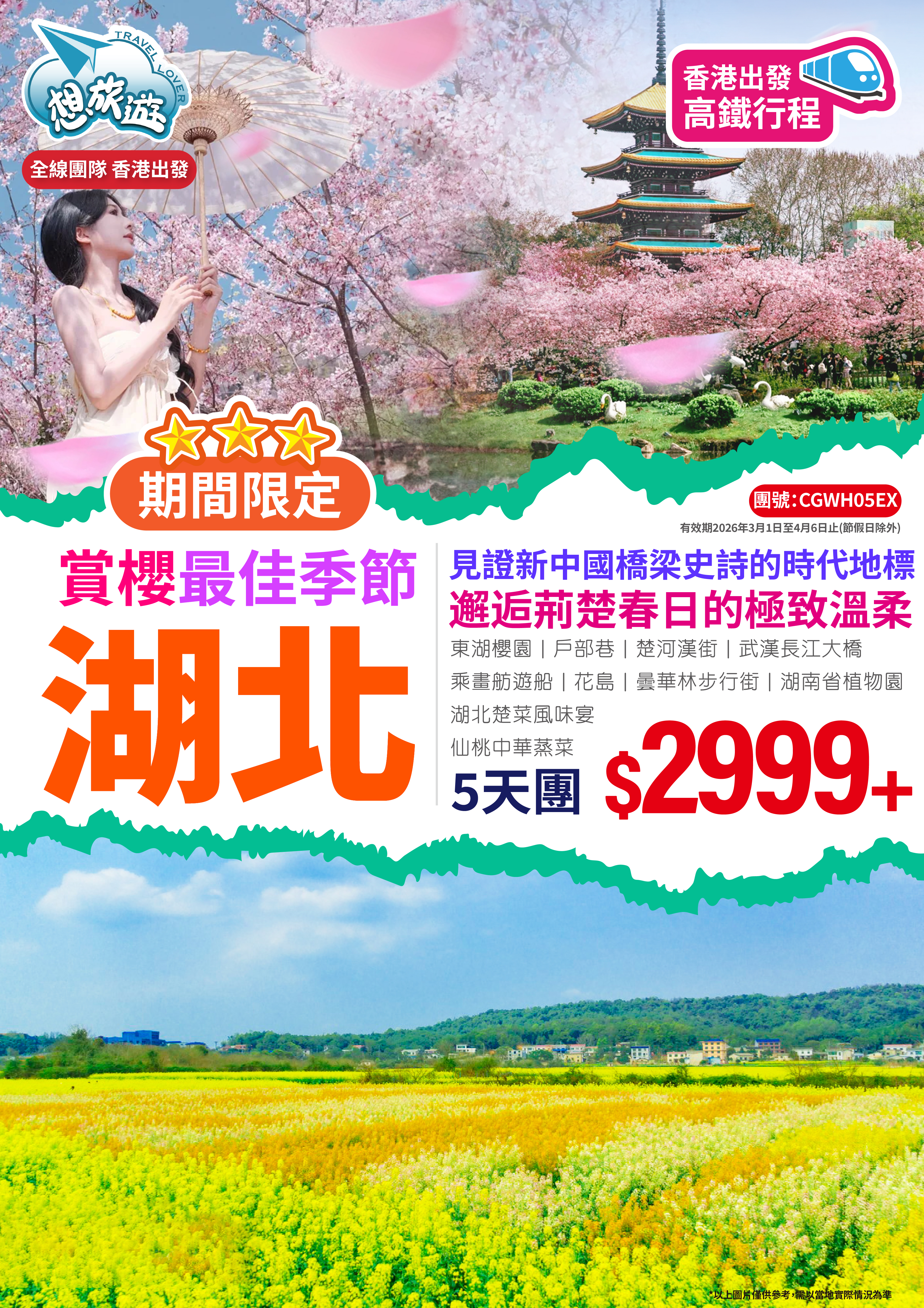 【時令限定相約湖北櫻花季】邂逅荊楚春日的極致溫柔 高鐵5天團