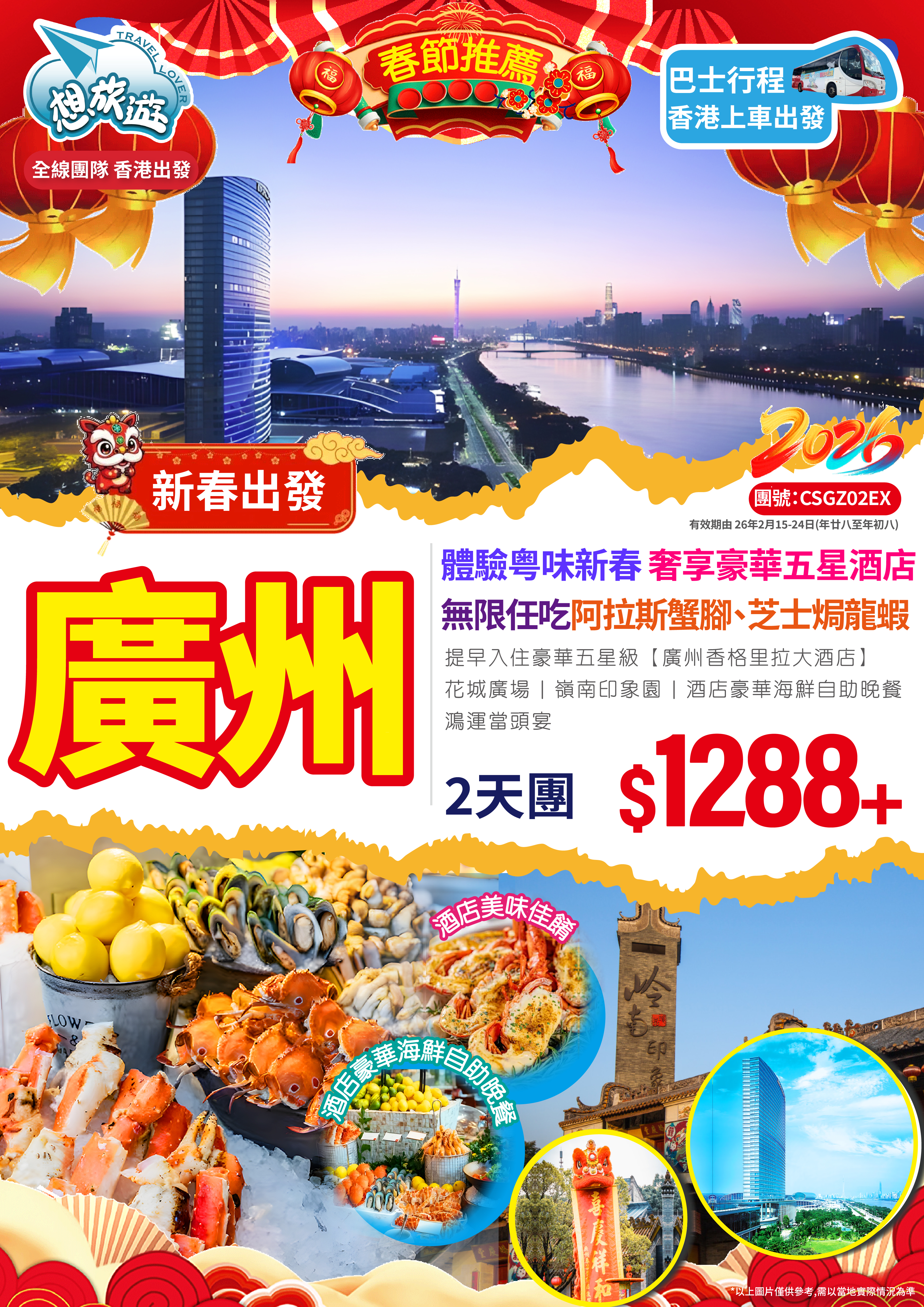 【春節加班】入住豪華五星【廣州香格里拉大酒店】豪歎【酒店豪華海鮮自助晚餐】無限任吃阿拉斯蟹腳、芝士焗龍蝦等等 2天團