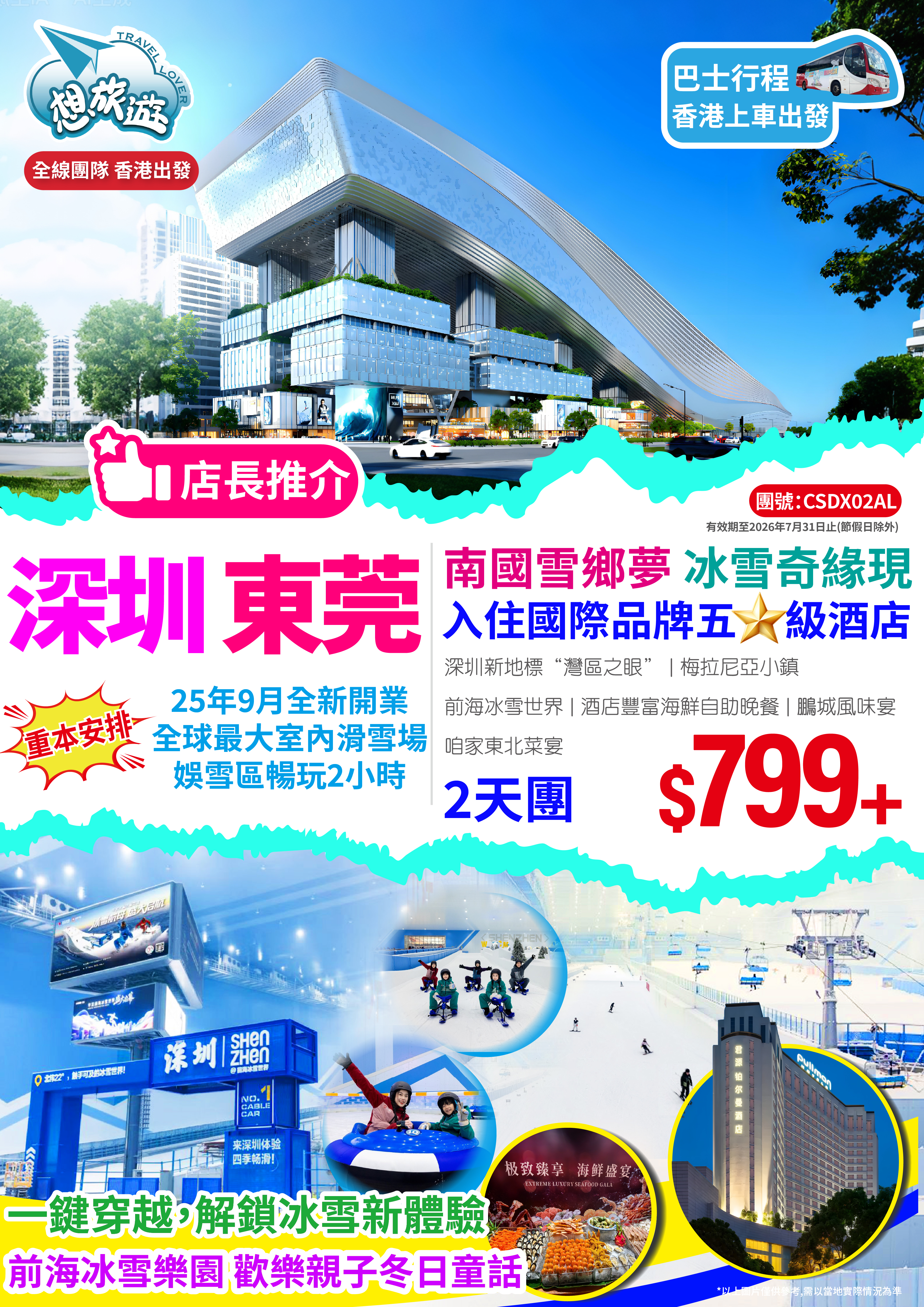 【樂園】深圳全新開幕·全球最大室內滑雪場【前海冰雪世界·熱雪奇跡】(2 小時娱雪)國際品牌五星東莞君源鉑爾曼酒店 豐富海鮮自助晚餐 純玩2天團