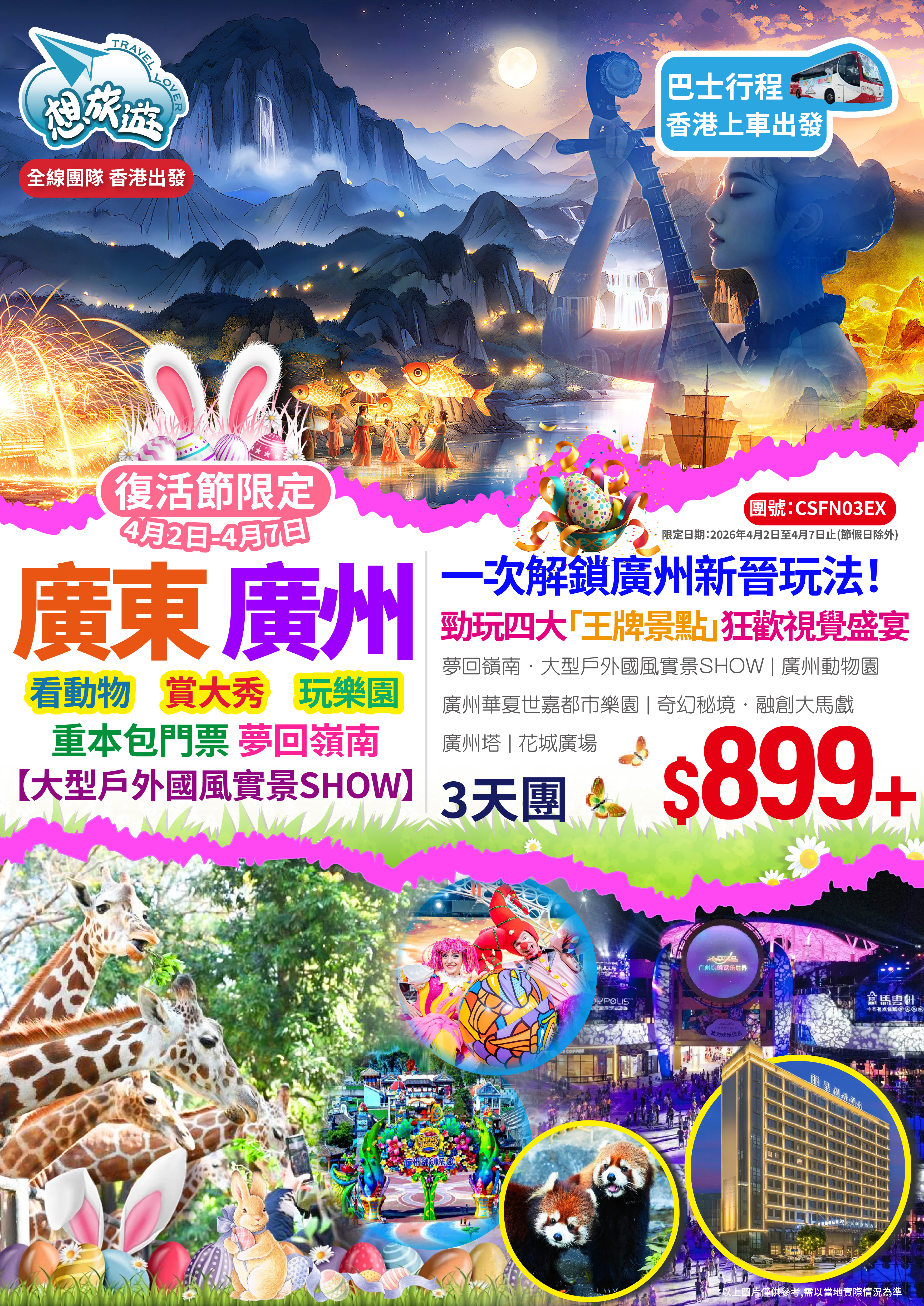 【復活節加班】融創國際大馬戲+【夢回嶺南·大型戶外國風實景SHOW】+【廣州動物園】+【廣州華夏世嘉都市樂園】3天團