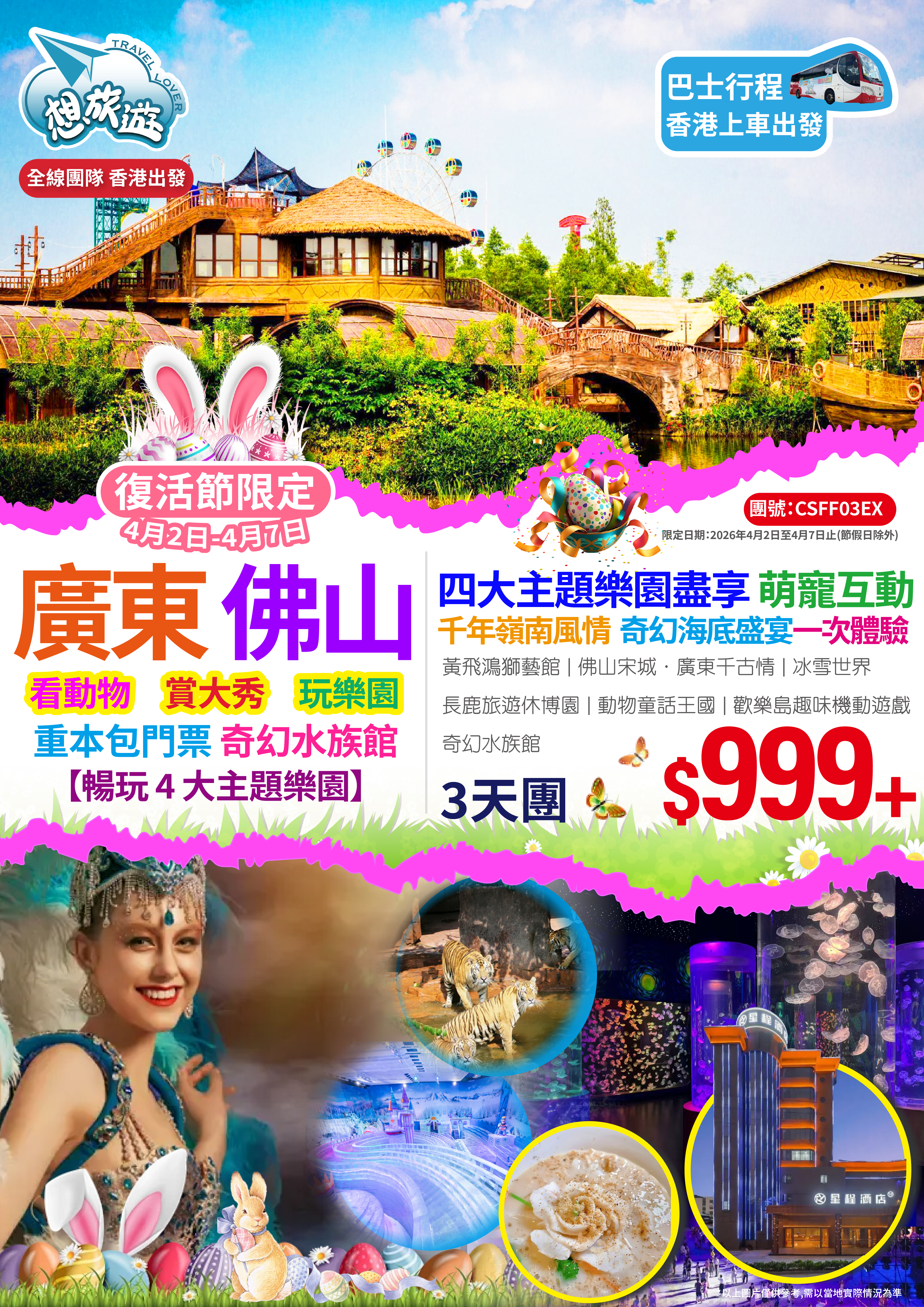 【復活節加班】暢玩4大主題樂園【奇幻水族館】【長鹿旅遊休博園】【冰雪世界】【廣東千古情】 純玩3天團