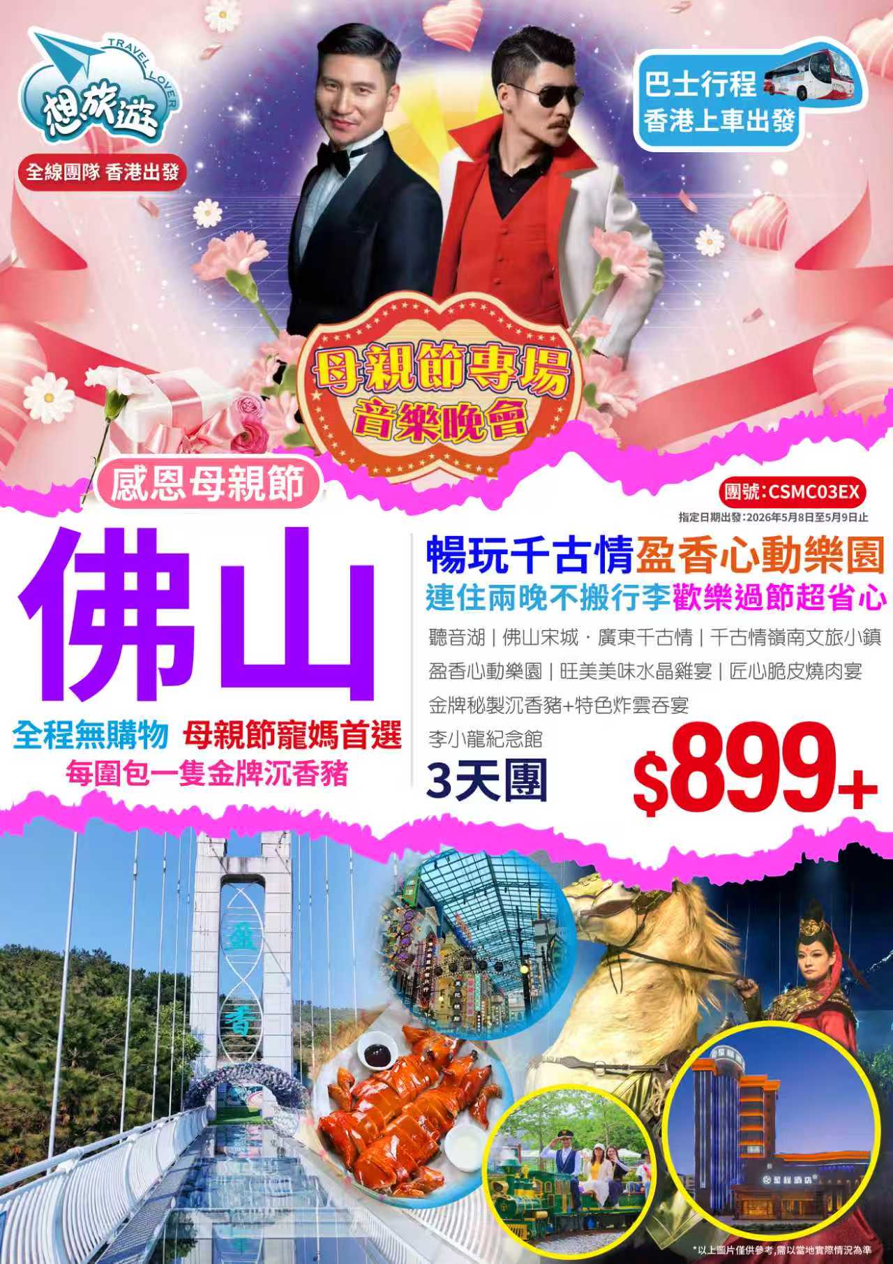 【母親節專場】感恩母親,感恩母愛,不喧嘩,自有聲,歲月如歌,共赴愛的盛宴 連住兩晚同間酒店,省心不用搬行李 玩轉【佛山宋城•廣東千古情】【盈香心動樂園】【金牌秘制沉香豬+特色炸雲吞宴】(保證每圍臺一只豬) 純玩 3天團