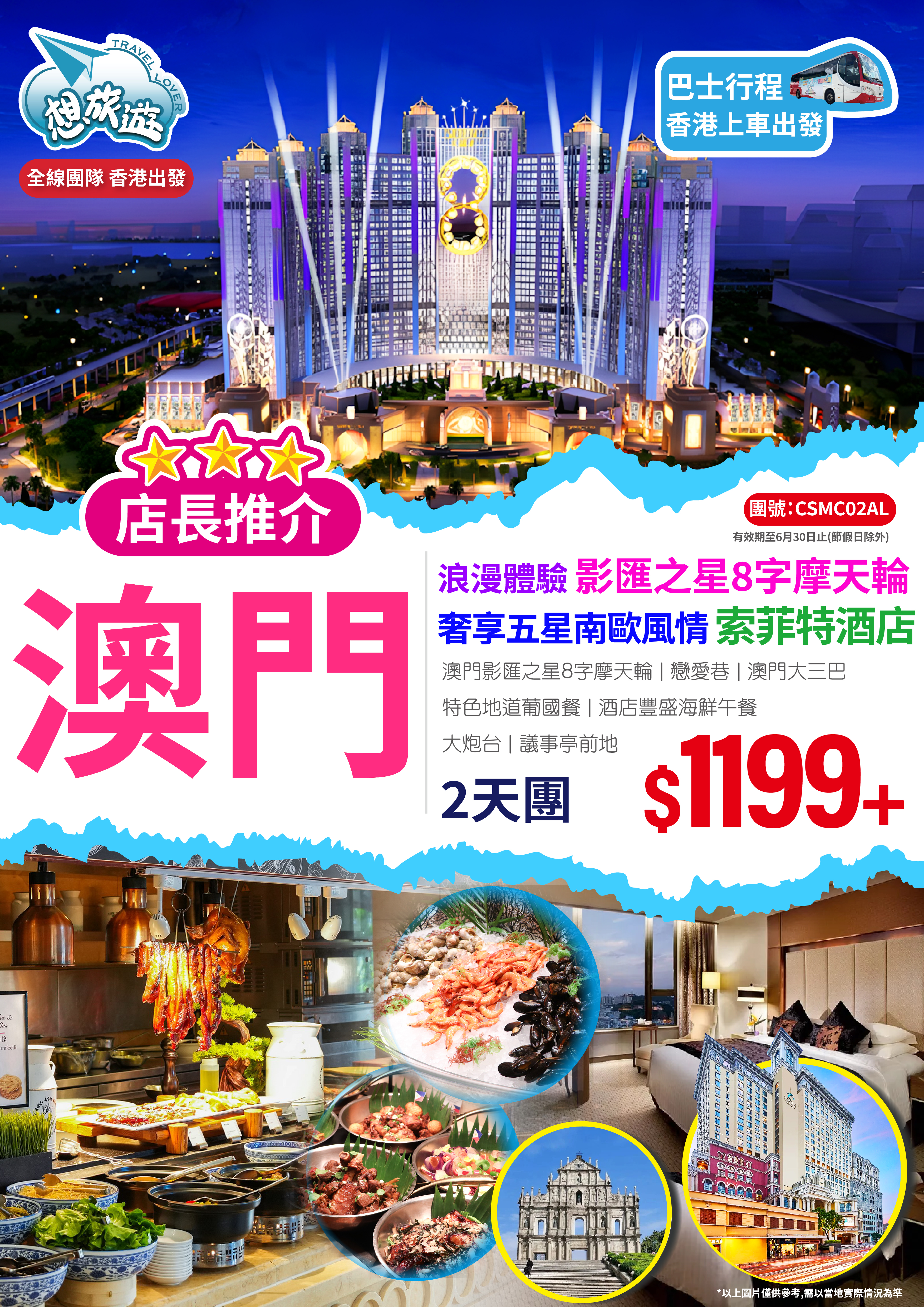 澳門/索菲特酒店/澳門影匯之星/摩天輪/葡國餐/酒店豐盛自助餐/純玩/直航船往返