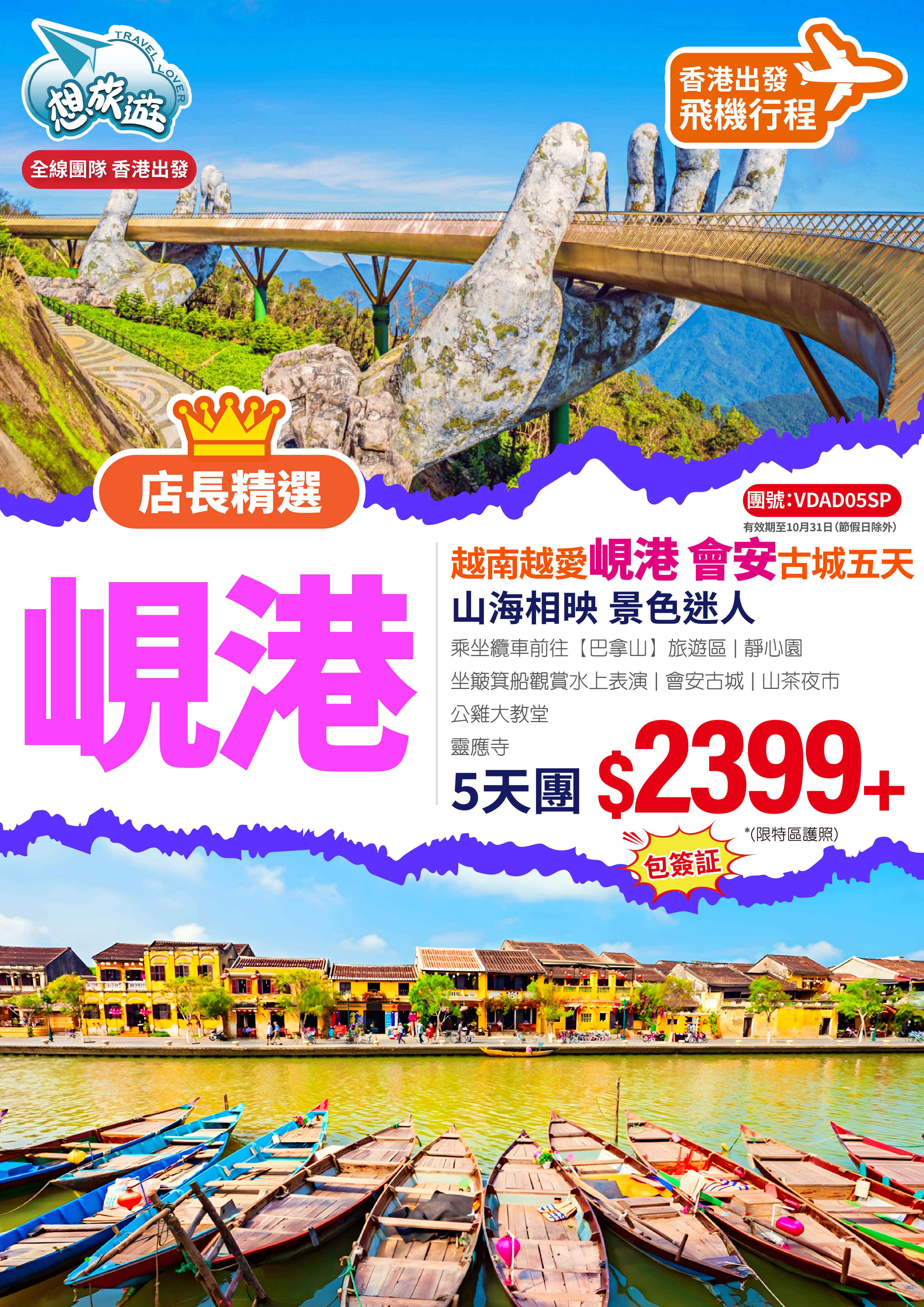 1. 團費不包括香港旅遊業監管局0.15%印花稅。2. 團費未包括當地導遊、旅遊車司機及旅行社相關人員之服務費每位每天HK$150,於完團前由領隊/導遊個別向團員收取。3. 旅遊證件必須於回程當日起計,最少六個月或以上有效期,均需預留一頁空白版面,方能報名參加。 4. 為使旅客獲得完善的旅遊保障 , 本公司建議所有團員出發前必須自行購買旅遊綜合保險5. 以上⾏程價格未含機場稅、燃油附加費及⾏政費等稅項,實際税項收費以出發當⽇及最終乘坐之航空公司收費為準,有關費⽤可瀏覽想旅遊網站查看或向職員查詢。6. 酒店、膳⻝及⾏程次序有可能因應實際情況⽽變動,均以航空公司及當地接待社安排為準,如有任何更改,恕不另⾏通知。7. 如遇以上酒店客滿,本公司將安排同級之酒店8. 航班時間只供參考及有可能更改,一切以航空公司公佈為準。此團有可能配搭不同航空公司之來回航班,顧客不得藉此而退出 *亞洲航空(AK)香港快運航空(UO)越捷航空(VJ)德威航空(TW)大灣區航空(HB)包基本寄艙行李及不包餐食*9. 確實團費均以報名時為準,旺季加幅另⾏通知10. 為確保消費者權益,詳情請參閱 (旅⾏團報名及責任細則),客⼈可向分⾏職員索取。11. 根據旅遊業監管局(旅監局)指引,旅⾏社如因『迫不得已理由』取消旅⾏團,處理相關退款時可收取主要服務供應商因應旅⾏團取消⽽徵收之退票及⼿續費,確實⾦額以供應商之最終回覆作準;有關收費請參閱旅⾏團細則及責任問題須知。或可⾃⾏瀏覽旅監局網站(https:tia.org.hk/)12. 所有單張及網頁之圖片僅供參考。13. 此團隊不設茶會,敬請留意。14. (高鐵及廣東省) 團隊或不設香港領隊,但仍設當地導遊接待 . (飛機線) 如團隊人數為14人以下,團隊或不設香港領隊, 但仍設當地導遊接待 , 所有不設領隊將安派工作人員於指定集合地點安排集合事宜。15. 旅客必須取得印花收據方可獲得『旅遊業監管局賠償基金』保障。Travellers must obtain a receipt with a levy stamp to be protected by the Travel Industry Compensation Fund。